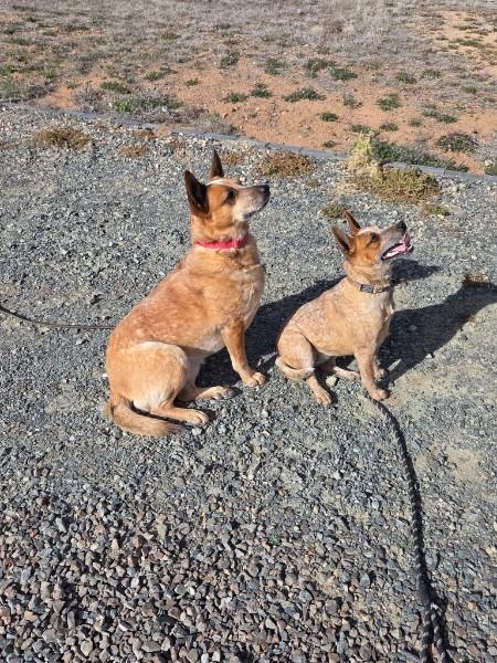 Here we have a photo of Scarlett (L), a Full-Sized Heeler, and Eden (R), a Miniature Heeler. Both of the dogs are fully grown adults.
